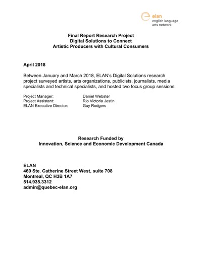 English Language Arts Network (ELAN). Digital Solutions to Connect Artistic Producers with Cultural Consumers. English-Language Arts Network (ELAN), April 2018.