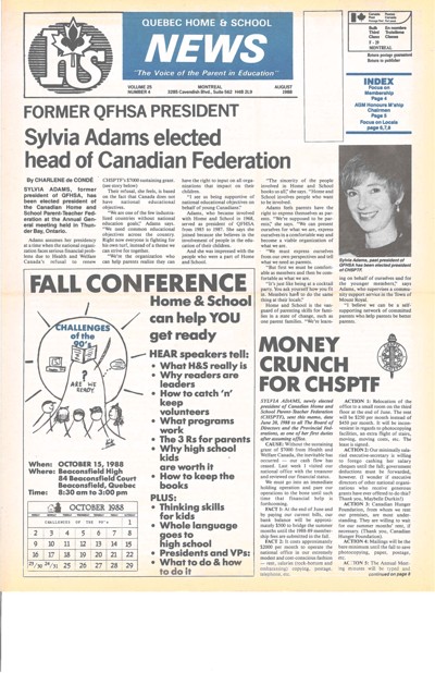 Quebec Federation of Home and School Associations (QFHSA). “Quebec Home & School News” 25, no. 4 (August 1988).