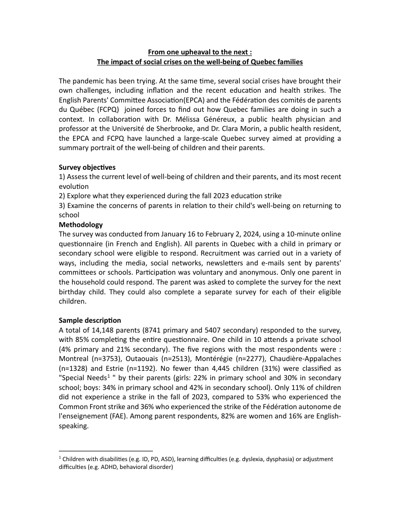 The pandemic has been trying. At the same time, several social crises have brought their own challenges, including inflation and the recent education and health strikes. The English Parents' Committee Association (EPCA) and the Fédération des comités de parents du Québec (FCPQ) joined forces to find out how Quebec families are doing in such a context. In collaboration with Dr. Mélissa Généreux, a public health physician and professor at the Université de Sherbrooke, and Dr. Clara Morin, a public health resident, the EPCA and FCPQ have launched a large-scale Quebec survey aimed at providing a summary portrait of the well-being of children and their parents.