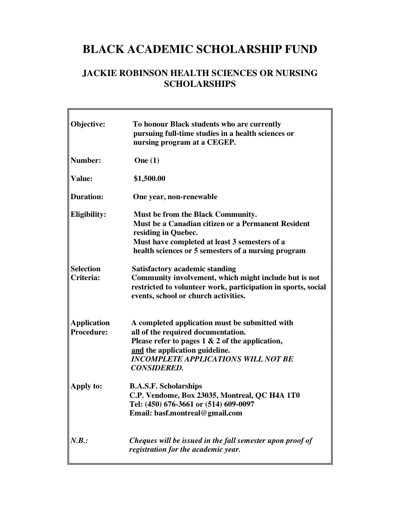 Black Academic Scholarship Fund (BASF). “Black Academic Scholarship Fund : Jackie Robinson Health Sciences or Nursing Scholarships,” n.d.