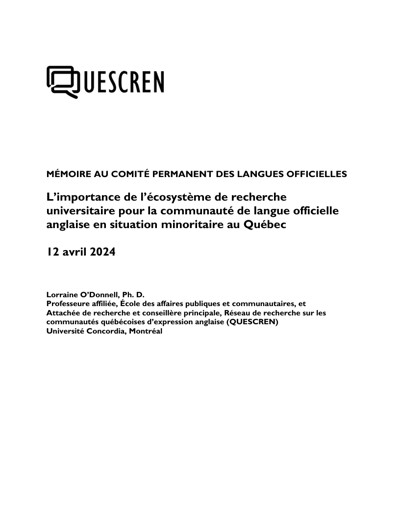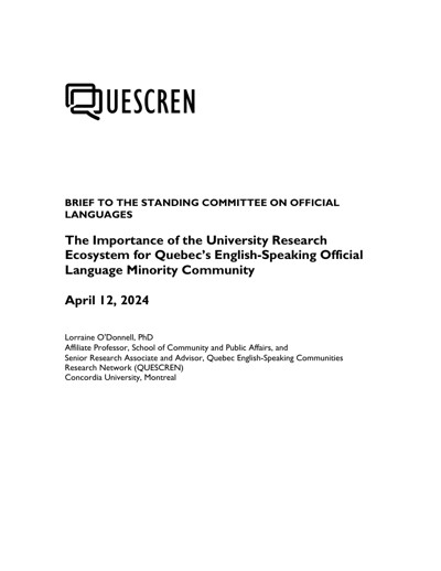 O’Donnell, Lorraine. Brief to the Standing Committee on Official Languages : The Importance of the University Research Ecosystem for Quebec’s English-Speaking Official Language Minority Community. Montreal, QC: Quebec English-Speaking Communities Research Network (QUESCREN), April 12, 2024.