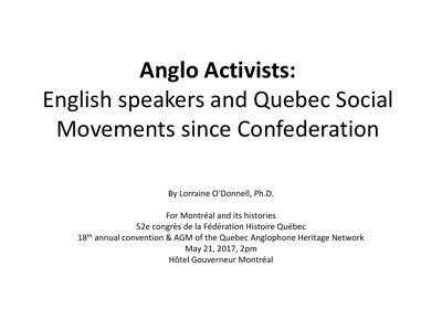 O’Donnell, Lorraine. “Anglo Activists : English Speakers and Quebec Social Movements since Confederation” Presented at the 18th Annual Convention of the Quebec Anglophone Heritage Network, Montréal, QC, May 21, 2017.