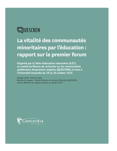 Cooper, Celine, Patrick Donovan, and Lorraine O’Donnell. Report on the First “Minority Community Vitality Through Education” Forum. Montreal, QC: Quebec English-speaking Communities Research Network (QUESCREN), October 28, 2018.