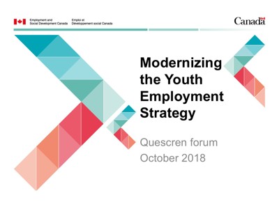 Canada. Employment and Social Development Canada. “Modernizing the Youth Employment Strategy” Presented at the QUESCREN Forum : Minority Community Vitality Through Education, Montréal, QC, October 28, 2018.