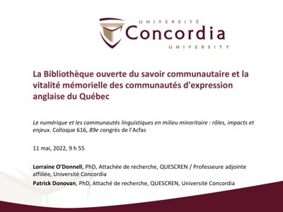O’Donnell, Lorraine, and Patrick Donovan. “La Bibliothèque ouverte du savoir communautaire et la vitalité mémorielle des communautés d’expression anglaise du Québec” Presented at the 89e Congrès de l’Acfas, Montréal, QC, May 11, 2022.