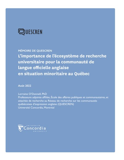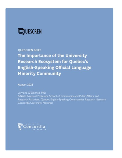 O’Donnell, Lorraine. The Importance of the University Research Ecosystem for Quebec’s English-Speaking Official Language Minority Community. Quebec English-Speaking Communities Research Network (QUESCREN), August 2022.
