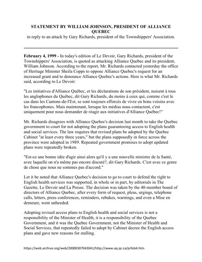 Johnson, William. “Statement by William Johnson, President of Alliance Quebec in Reply to an Attack by Gary Richards, President of the Townshippers’ Association,” February 4, 1999.